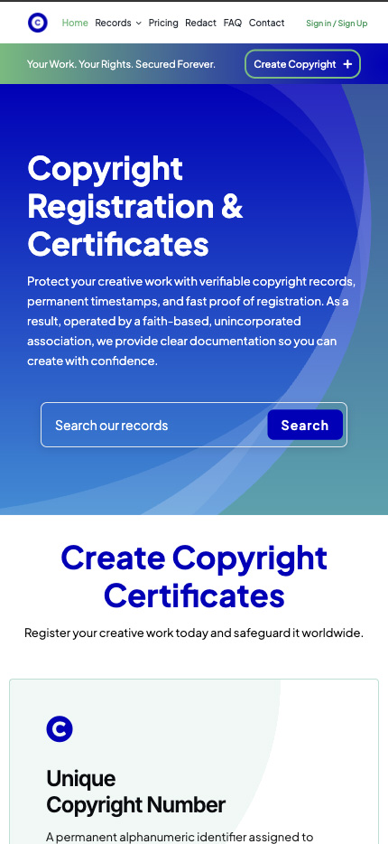 Copyright Records is a custom-built copyright record creator and searchable public database designed to issue verifiable documentation for creative works. Each record generates a unique serial number and QR code for instant validation, providing creators with secure timestamped proof of authorship. The platform is especially valuable for individuals seeking to establish structured common law copyright documentation through an ecclesiastical recording framework.